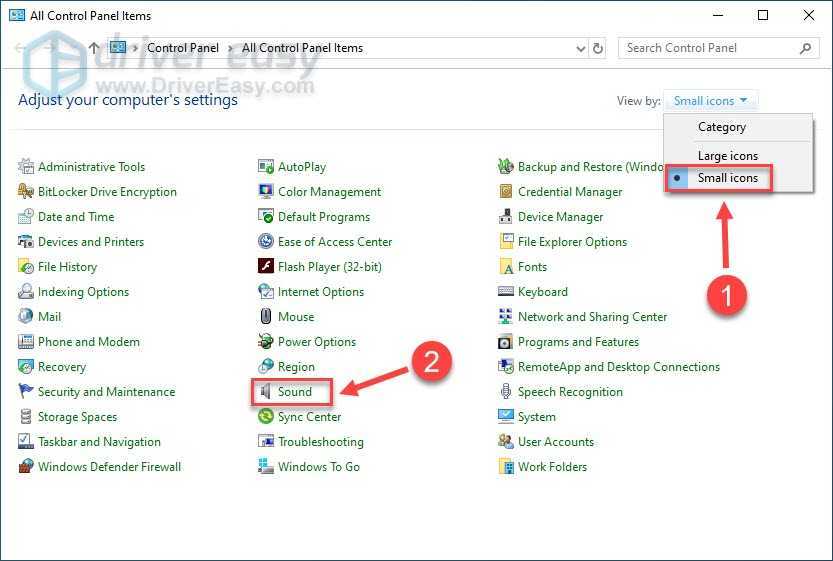 3) Выбрать Маленькие значки под Просмотр по . Затем щелкните Звук .