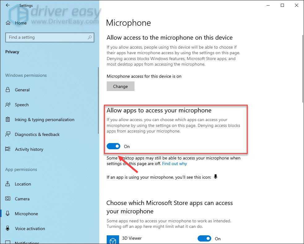 - Включите переключатель «Разрешить приложениям доступ к вашему микрофону».