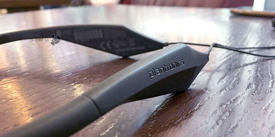 Plantronics BackBeat 100 — это ободок на шею и торчащие из него провода с наушниками на концах. Ободок сделан наполовину из обычного пластика, наполовину — из прорезиненного. Кожи касается в основном резиновая часть, никакого дискомфорта она вообще не доставляет. Не могу сказать, что конструкция прямо-таки невесомая, но в течение дня о ней не вспоминаешь.