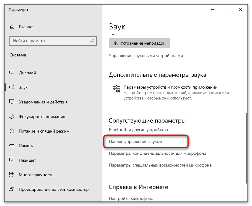 В «десятке» откроется отдельное окно, где вас интересует ссылка «Панель управления звуком».