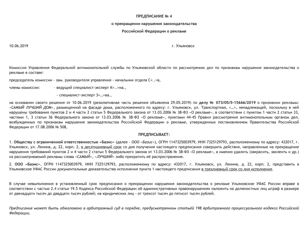 Пример предписания за использование слогана «Самый лучший дом» в базе ФАС