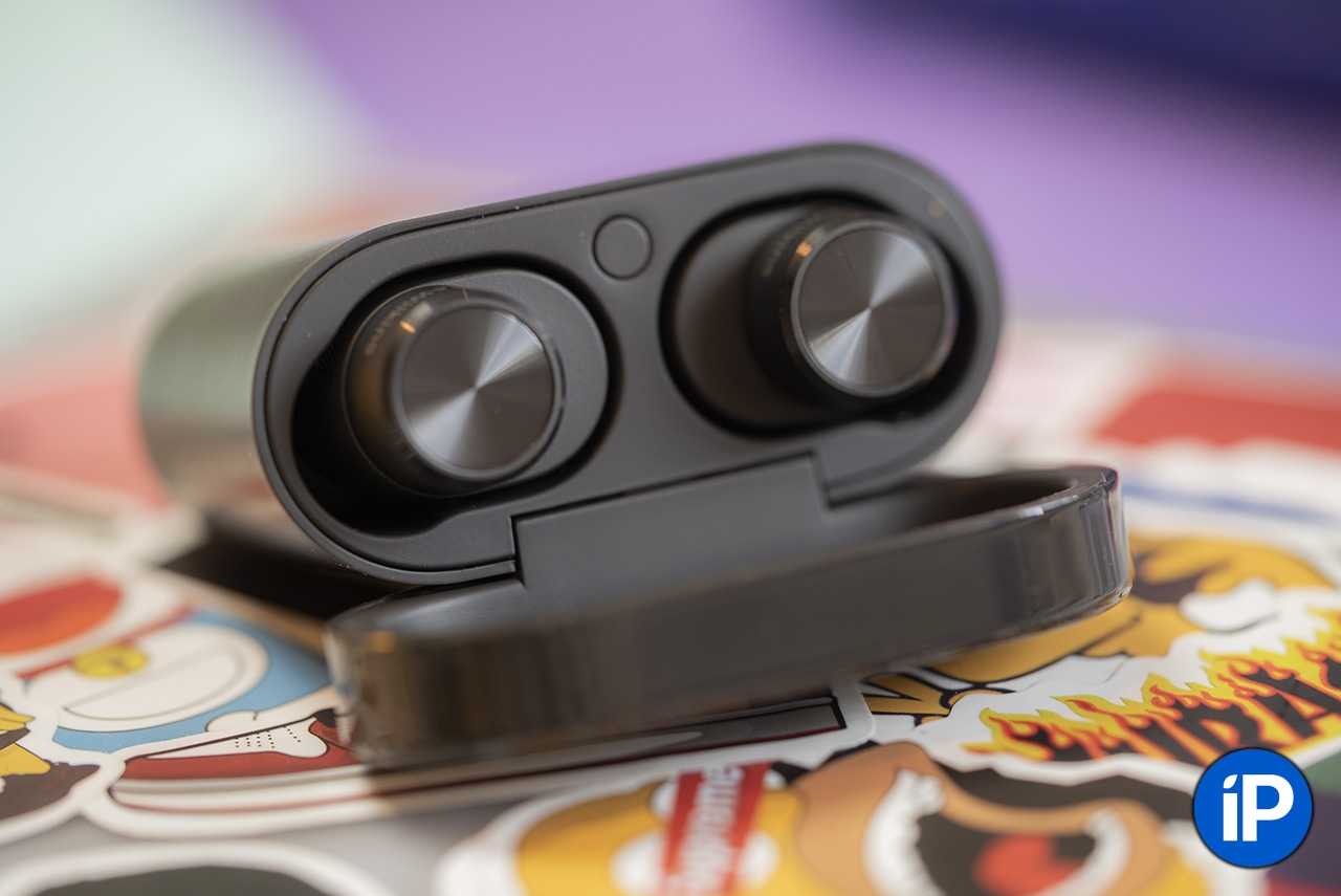 Наушники хранятся в футляре, который одновременно является зарядным устройством. Кейс выполнен из матового пластика, крышка с логотипом бренда глянцевая. На корпусе есть светоиндикатор, который показывает состояние заряда кейса, а также разъём для кабеля USB-C.