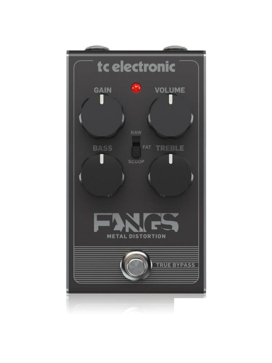 TC Electronic Fangs Metal Distortion — педаль эффекта дисторшн, созданная для настоящего металла. Её название говорит за себя. Эффект позволяет получить мощный, плотный, густой звук, а гибкие возможности регулировки частот делают ее подходящей для разных направлений металла: от трэша до дума, от классического хеви до ню-метала. Управление осуществляется с помощью четырех регуляторов: Gain (настраивает уровень перегруза), Volume (регулирует уровень выходного сигнала) и эквалайзер: Bass для нижних частот и Treble для верхних. Дополнительный переключатель позволяет выбрать настройки для средних частот.