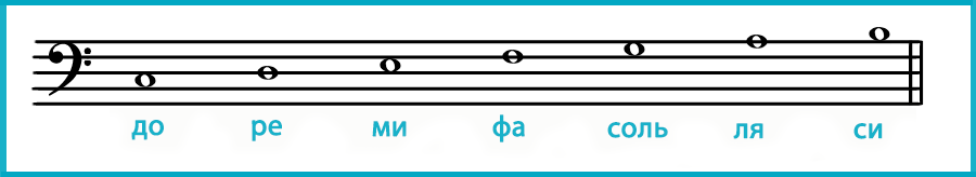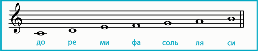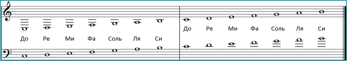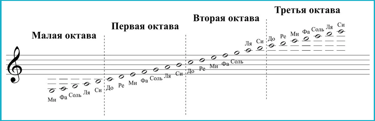 Название «Скрипичный» он получил потому, что охватывает диапазон в котором играет скрипка. Вот как выглядит расположение нот в скрипичном ключе, в первой октаве.