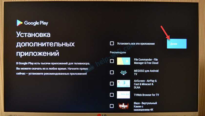 Следующий шаг – установка дополнительных приложений. Система предложит вам установить несколько приложений. Если вы не откажетесь (не снимете галочки), то они будут установлены автоматически в фоновом режиме. Я рекомендую отменить установку этих приложений (а то приставка будет подтормаживать после настройки из-за их установки). Все необходимые приложения вы сможете самостоятельно установки из маркета.