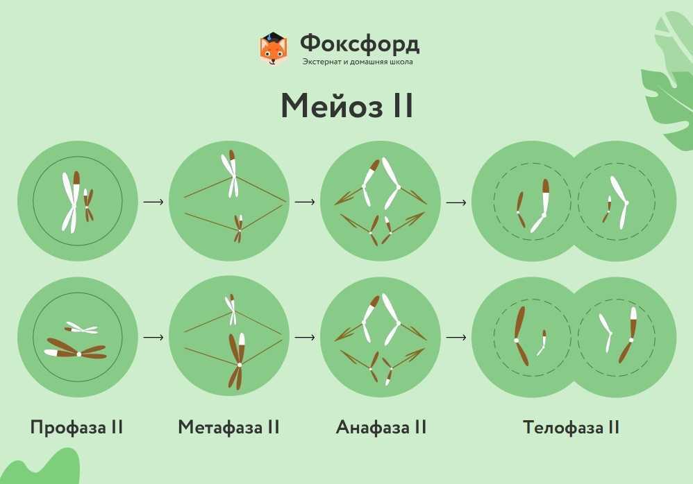 - Телофаза II (1n1c) — происходит деспирализация хромосом, формирование ядерных оболочек и разделение цитоплазмы; в результате двух делений из диплоидной материнской клетки получается четыре гаплоидных дочерних клетки.