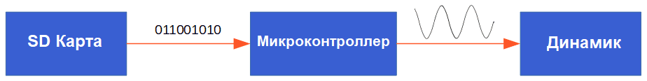 Если мы хотим воспроизвести цифровой аудиофайл с помощью платы микроконтроллера, мы должны рассмотреть всю цепочку цифрового аудио. Следующий схематический рисунок показывает, как аудиофайл сохраняется на SD-карте и считывается с платы микроконтроллера. Затем плата подключается к динамику через цифровой контакт и землю.