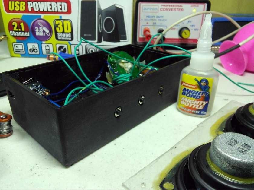 - Аккумулятор и усилитель помещаем внутрь корпуса. Для того, чтобы придать элементам жесткости, просто посадите их на клей. Можно использовать и другие методы крепления. Главная задача — исключить перемещение внутри корпуса.