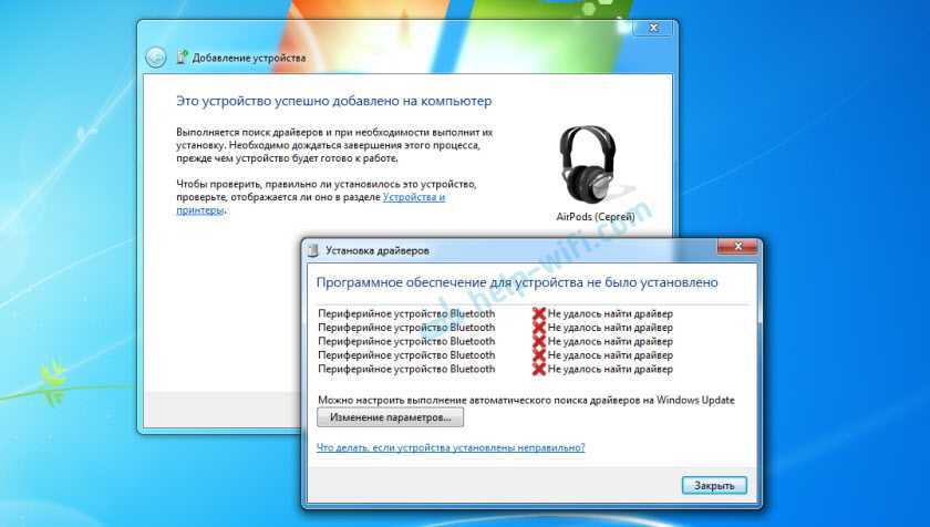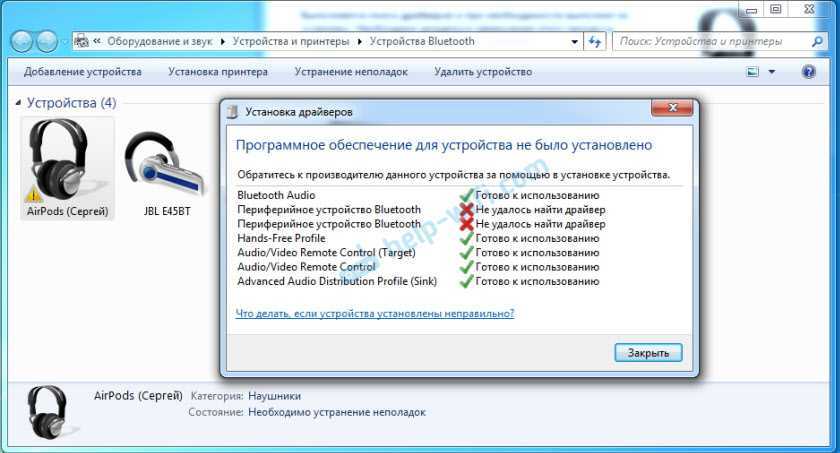 Дальше я просто удалил AirPods из списка уже подключенных устройств (так как я уже пробовал их подключить) и установил соединение заново. И уже в этот раз Windows 7 установила практически все драйвера. Кроме «Периферийное устройство Bluetooth». Но наушники без проблем начали работать, несмотря на то, что возле них остался желтый восклицательный знак.