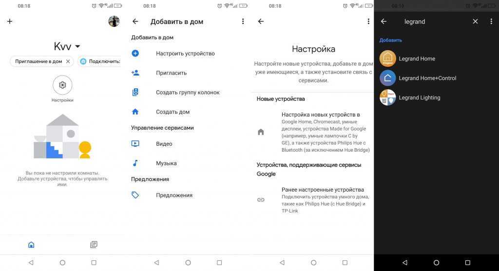 Теперь можно подключать Legrand Home + Control к голосовым помощникам. Начнем с Google Assistant. Для этого открываем приложение Google Home, жмем + в левом верхнем углу, чтобы добавить устройство. Выбираем Настроить устройство > Ранее настроенные устройства и в большом списке ищем Legrand Home + Control.