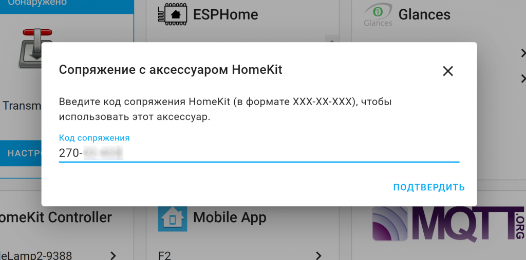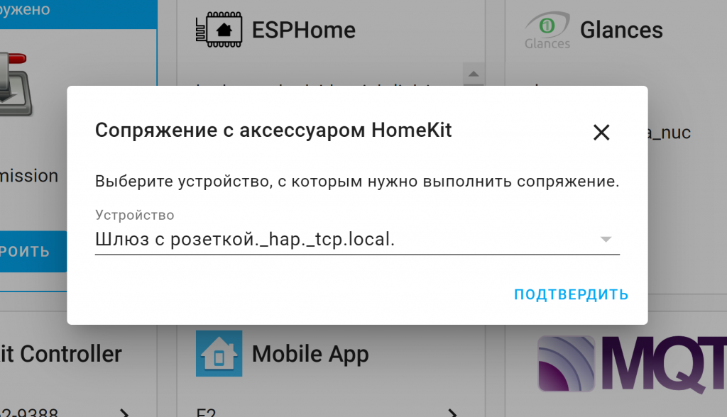 iPhone у меня для тестов, увы, не завалялся. Поэтому настройку с приложением «Дом» я показать не смогу. Зато я смог добавить шлюз с подключенными устройствами в Home Assistant через интеграцию HomeKit Controller.