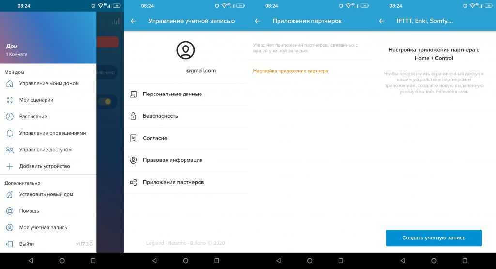 Пару устройств добавили, теперь можно подключить шлюз к Google Assistant и Яндекс Алиса. Но перед этим нужно активировать эту функцию в приложении Legrand Home + Control. Переходим в пункт меню Моя учетная запись > Приложения партнеров > Настройка приложения партнера где нам предложат создать для этих целей отдельную учетную запись.