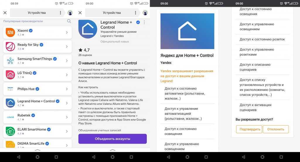 В списке популярных производителей будет Legrand Home + Control, выбираем. После жмем Объединить аккаунты и разрешаем доступ Яндексу к нашим устройствам.