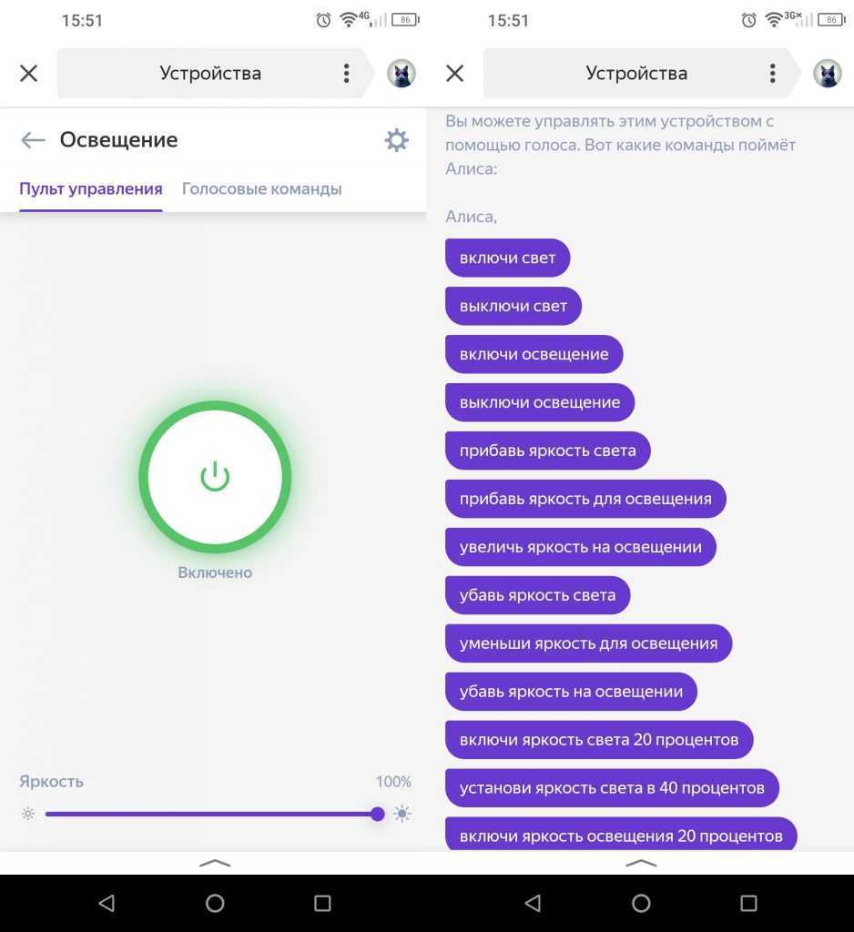 Все возможные варианты голосовых команд будут перечислены во вкладке «Голосовые команды» у каждого устройства.