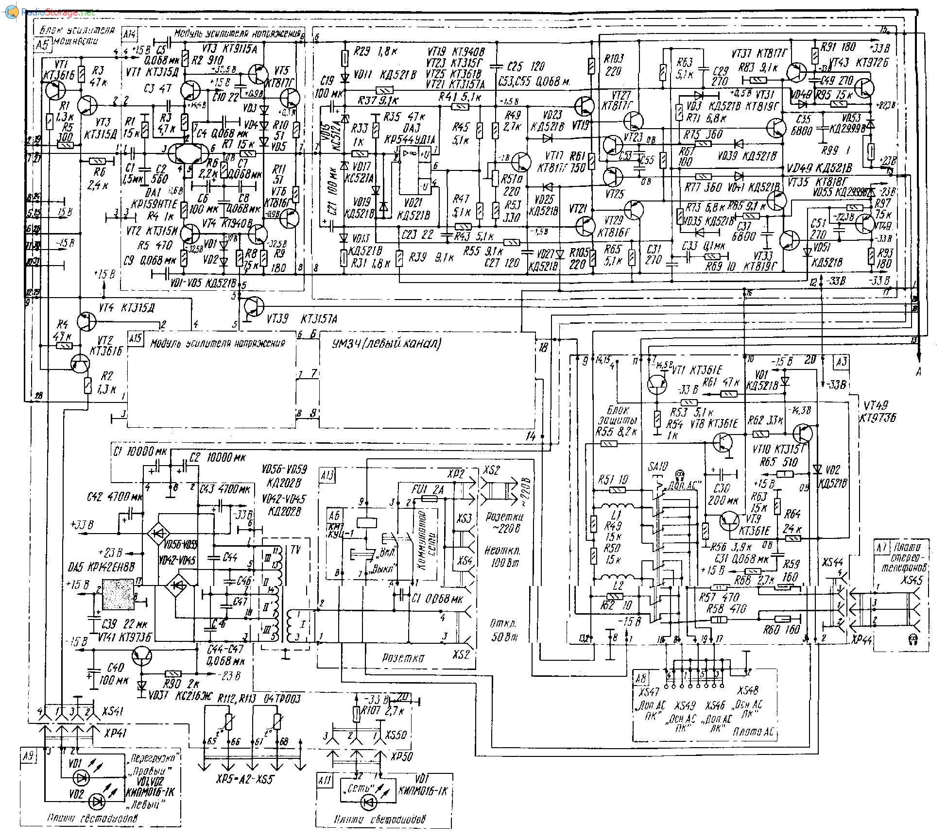Усилитель Вега 50У-122С. Принципиальная электрическая схема усилителя и его блоков, фото и внешний вид устройства. Вид спереди + сзади + внутри усилителя.