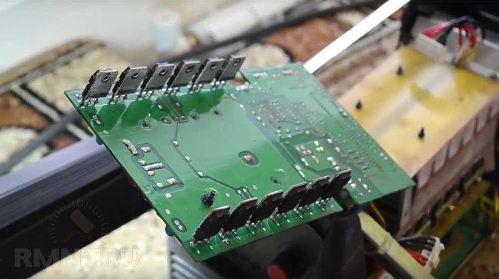 Далее по схеме находится непосредственно инвертор. Эта часть также легко поддаётся идентификации, здесь располагается крупнейший алюминиевый радиатор. Инвертор строится на нескольких высокочастотных полевых транзисторах или IGBT-транзисторах. Довольно часто несколько силовых элементов объединены в общем корпусе. Инвертор снова преобразует постоянный ток в переменный, но при этом частота его существенно выше — порядка 50 кГц. Такая цепочка преобразований позволяет использовать высокочастотный трансформатор, который в разы меньше и легче обычного.