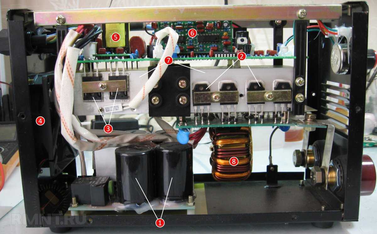 Конструкция сварочного инвертора: 1 — конденсаторы фильтра; 2 — выпрямитель (диодная сборка); 3 — IGBT-транзисторы; 4 — вентилятор; 5 — понижающий трансформатор; 6 — плата управления; 7 — радиаторы; 8 — дроссель