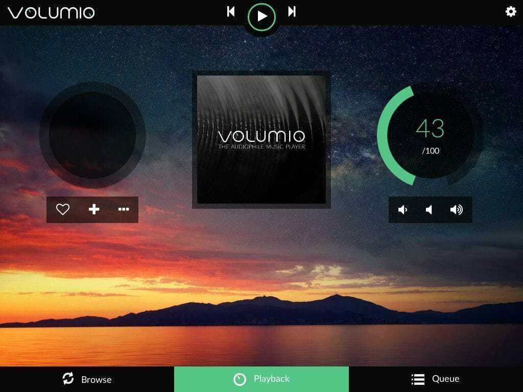 Volumio состоит из трех основных разделов. Первый — это то, что вы увидите сразу после начальной настройки. Это экран воспроизведения. Он показывает, какая песня в данный момент воспроизводится, и позволяет регулировать громкость.