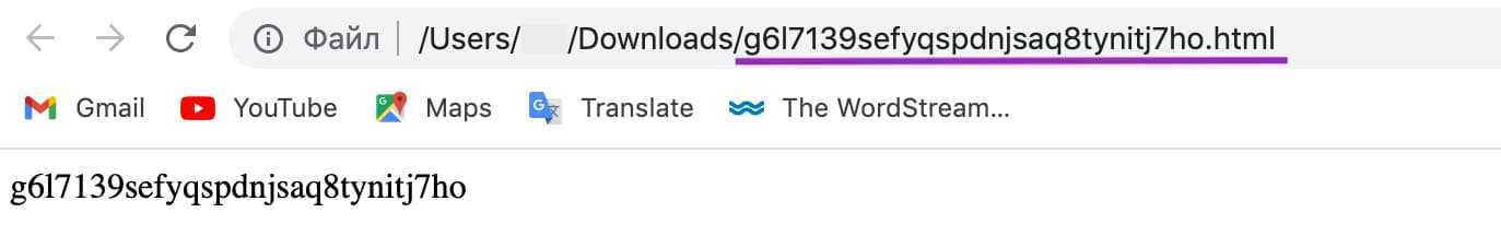 - Откройте файл в браузере и скопируйте имя после слова «Downloads» и содержимое файла. В случае скачивания файла несколько раз, в имени, открывшемся в браузере, может быть лишний символ с порядковым номером: (1), (2) и т.п. Обязательно удалите его, иначе не получится подтвердить права.