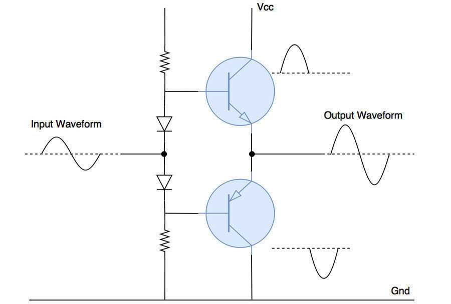 Это вполне логично, ведь при таком раскладе оба транзистора работают с нулевым смещением. Пока на входе усилителя присутствует положительная полуволна — работает один транзистор, а когда приходит время воспроизводить отрицательную полуволну, первый транзистор полностью закрывается и вместо него в работу включается второй. В английском варианте этот принцип действия получил название push-pull или, говоря по-русски, «тяни-толкай», что в общем-то очень хорошо описывает происходящее.