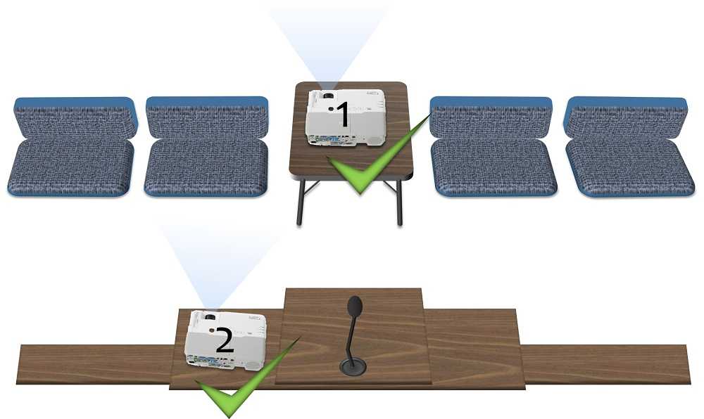 Установите проектор прямо напротив экрана так чтобы он не был на одной линии с выступающим/ докладчиком, а также чтобы он не бил светом в его глаза, а выступающий не загораживал изображение. Примените регулировку для компенсации неправильной центровки или наклона проекта (детально описано ниже в разделе «Регулировка проектора»).