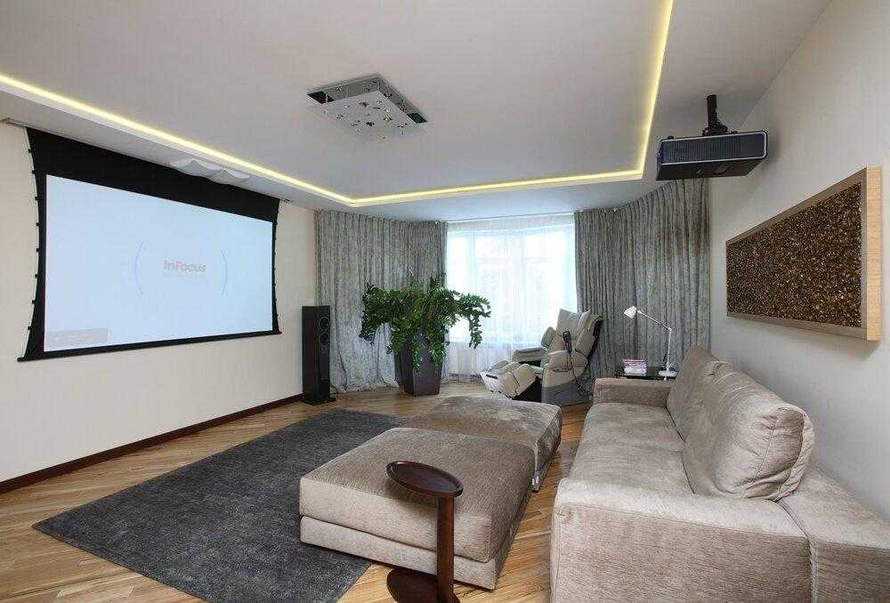 Безусловно, использование специального экрана повлечёт за собой дополнительные расходы, но оно того сто́ит. Максимальный комфорт во время просмотра – достойная компенсация потраченных средств и приложенных усилий. Совершенно необязательно, чтобы экран располагался возле стены. Его можно установить и посредине комнаты.