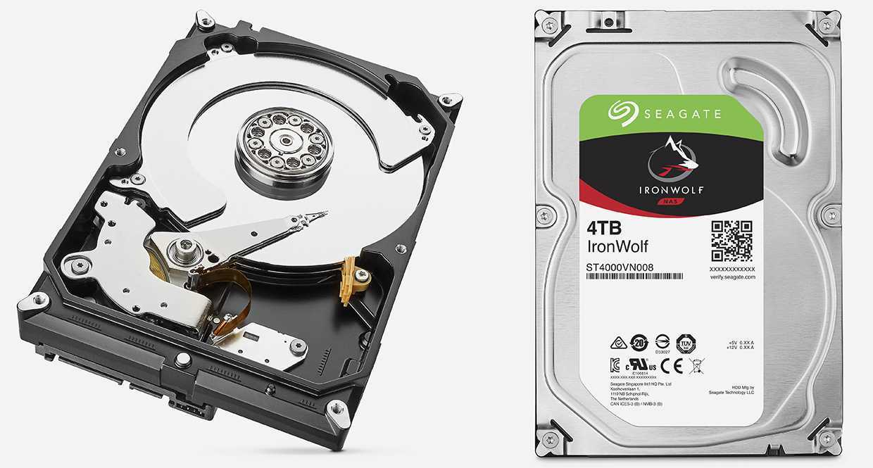 Короче говоря, это мощная штука, фактически отдельный компьютер под хранение файлов. Внутри у меня установлены 4 диска Seagate Ironwolf (ST4000VN008) ёмкостью по 4 терабайта каждый. Тихие, быстрые (5900 оборотов в минуту, кэш 64 Мб) и отказоустойчивые, они специально заточены под задачи NAS.
