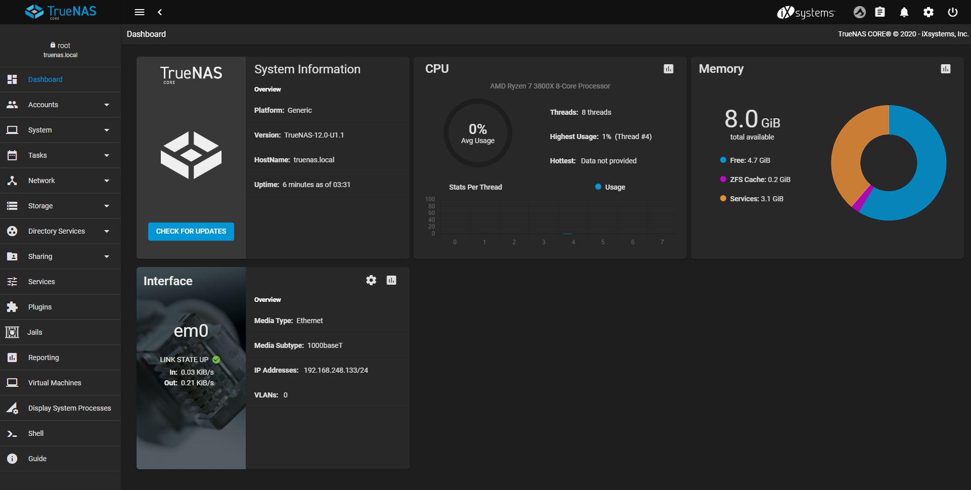 Оказавшись внутри, мы сможем увидеть различную конфигурацию и отображать меню для различных параметров. Например, у нас будет доступ к информации об операционной системе, характеристикам и статусу ЦП, ОЗУ, а также к сетевому интерфейсу. Однако, когда мы настраиваем хранилище, мы также можем его видеть, чтобы правильно им управлять.