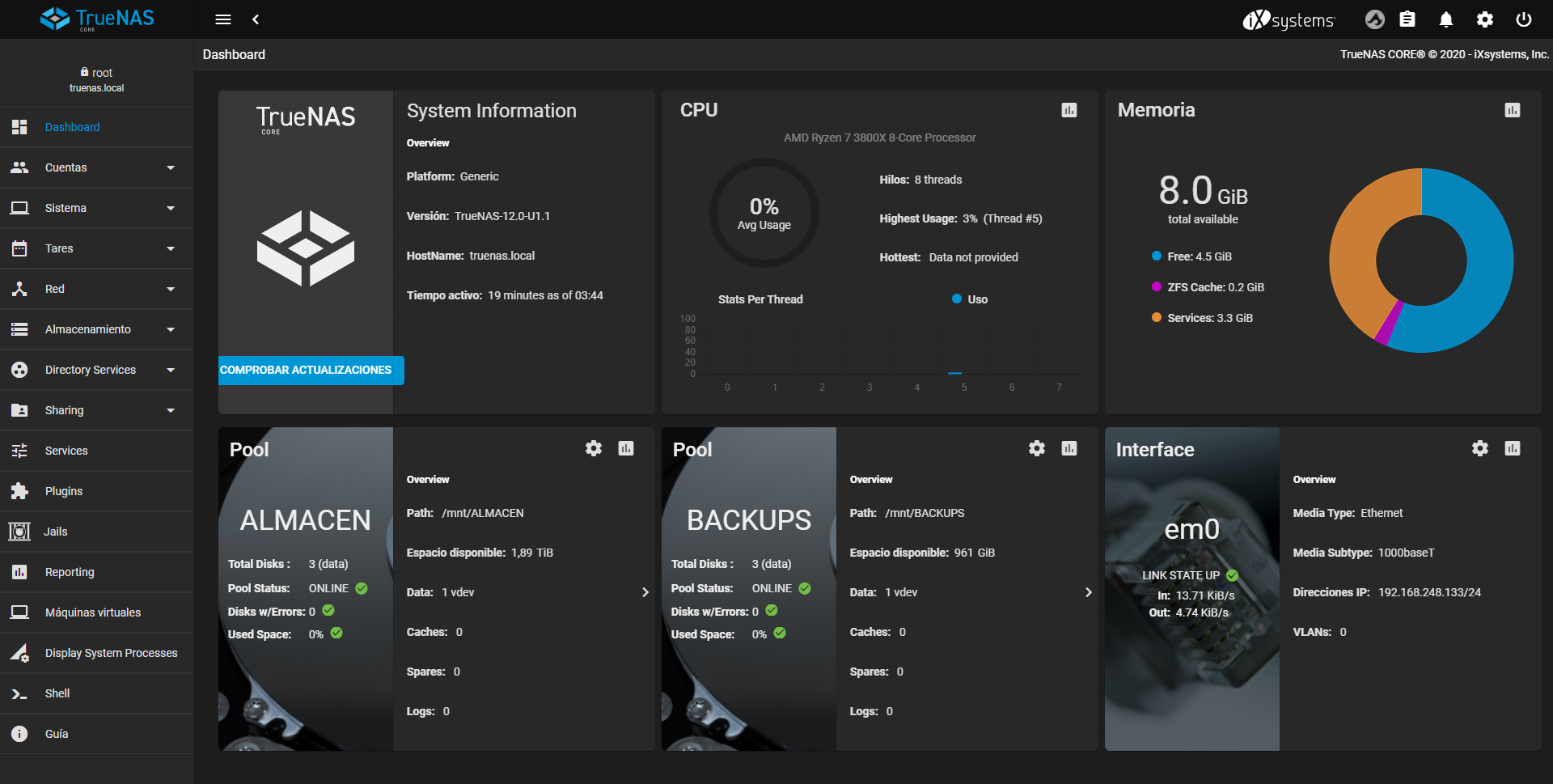 TrueNAS CORE — это новое название популярной операционной системы FreeNAS, ориентированной на NAS, операционной системы, специально разработанной для работы в качестве высокопроизводительного профессионального NAS-сервера. Эта операционная система может быть установлена на любой платформе x64 благодаря тому, что базовой операционной системой является FreeBSD версии 12. TrueNAS включает совместимость с большим количеством оборудования, будь то материнские платы и сетевые карты, которые являются двумя устройствами, с которыми может возникнуть больше проблем. дайте. NAS означает сетевое хранилище, а TrueNAS значительно упрощает использование и настройку всех служб, которые должен иметь сервер NAS, таких как сервер Samba, FTP, NFS, хранилище с RAID, удаленный доступ через OpenVPN и многое другое.
