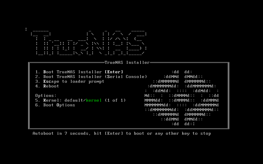 Когда у нас все настроено, мы приступаем к запуску операционной системы, и мы видим логотип TrueNAS и различные параметры, здесь нам вообще нечего трогать, мы даем несколько секунд, и он начнется автоматически, чтобы продолжить установку. операционная система.