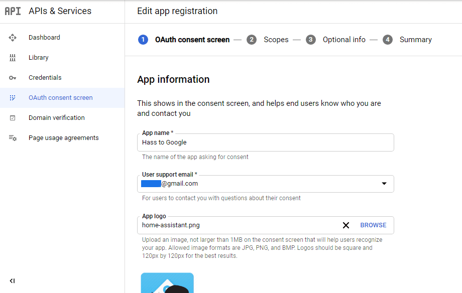 Следующим шагом заполните необходимые поля формы, но, если вы хотите добавить логотип к своему приложению, будьте готовы к верификации со стороны google, иначе, оставьте форму без app logo