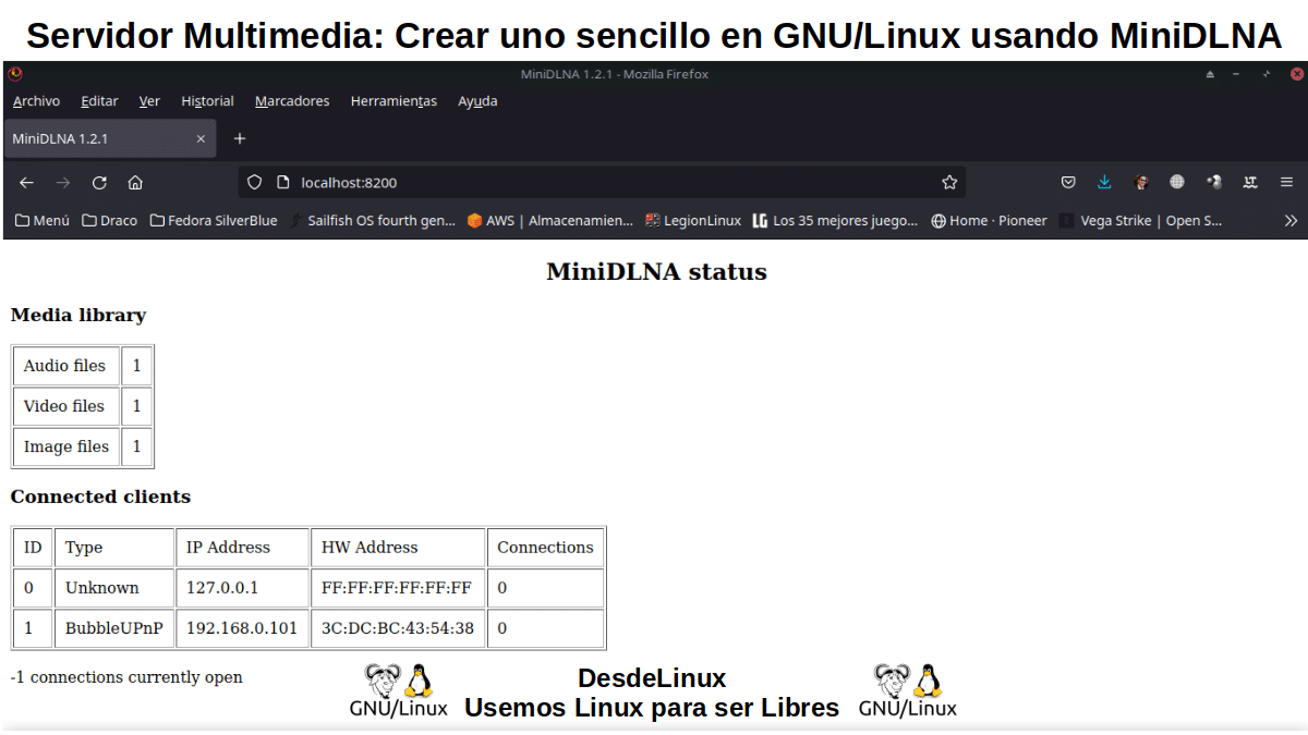Если мы получим доступ к нашему локальному IP-адресу через Интернет или с любого компьютера и установим порт 8200, мы получим доступ к веб-интерфейсу состояния miniDLNA. Здесь мы увидим только медиатеку, количество аудио, видео и файлов изображений. Мы также сможем увидеть клиентов, подключенных в данный момент к медиасерверу DLNA, с их IP-адресами, MAC-адресами и количеством подключений.