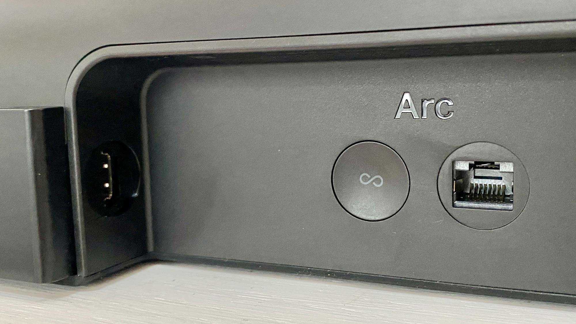 На задней стороне балки мы ничего не найдём (её можно, при желании, прижать к стене), а под ней мы найдём разъемы в количестве, достаточном для звуковой панели. У нас есть два сигнальных входа в стандарте HDMI 2.1 (ранее 2.0) и один ТВ-выход с поддержкой eARC (и обычного ARC). Старое высококлассное оборудование также можно подключить с помощью оптического разъема (Toslink).