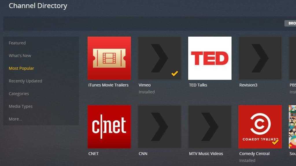 Plex упрощает установку линейки официальных плагинов. На сервере нет полноценного магазина приложений с рейтингами и отзывами, но он старается показать вам самые популярные и полезные плагины.
