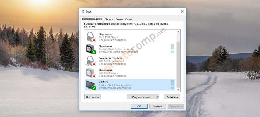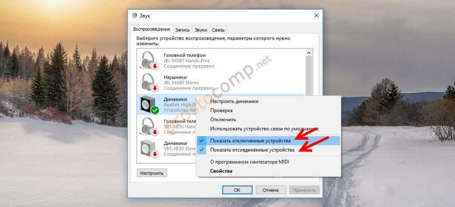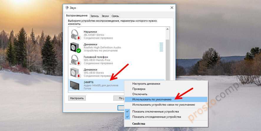 Нужно кликнуть по его иконке и назначить устройством воспроизведения звука по умолчанию. Чтобы подтвердить действие, нажать «Применить». Если телевизор не отображается, нужно щелкнуть мышью в пустом месте окна и в контекстном меню выбрать показ отключенных и отсоединенных устройств.
