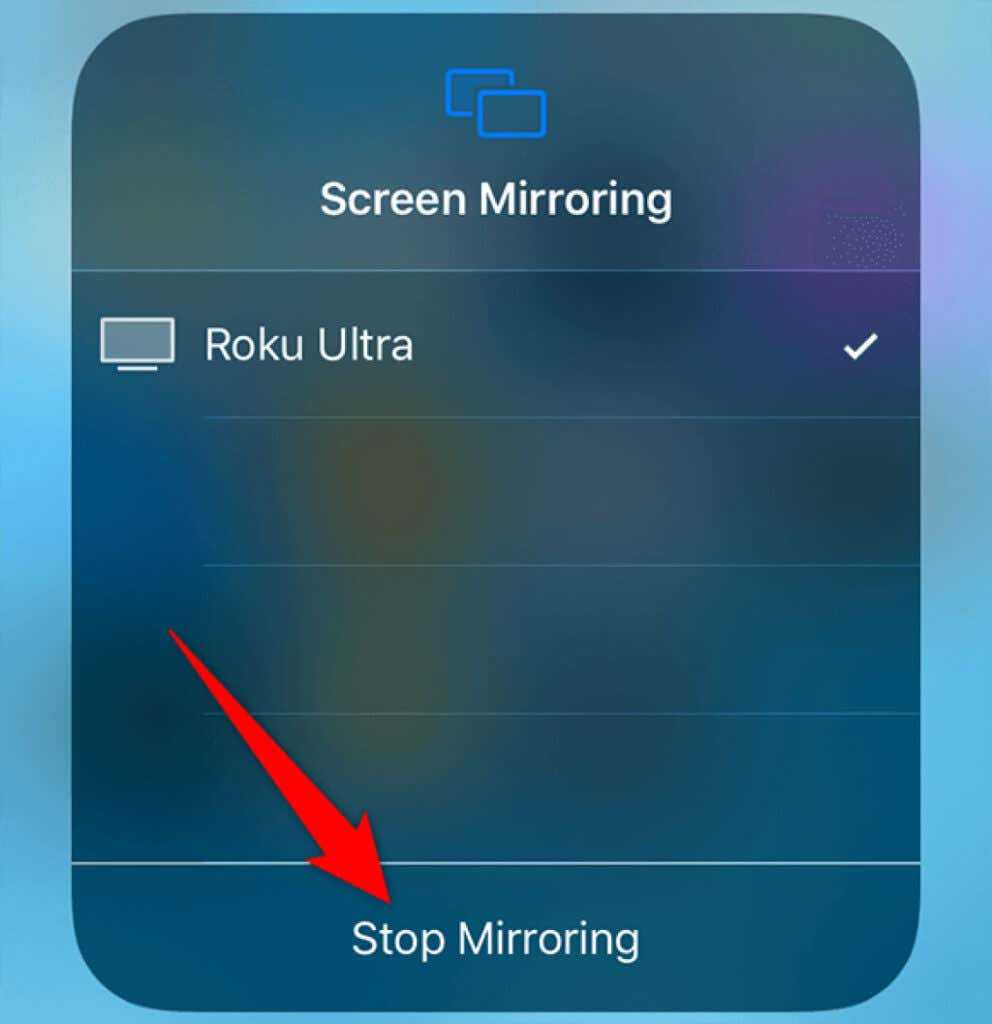 - Чтобы остановить зеркальное отображение экрана iPhone или iPad, коснитесь «Остановить зеркальное отображение» на своем устройстве.