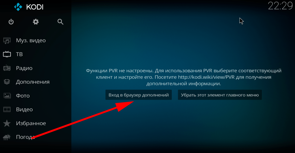 Во вкладке ТВ перейдите в Браузер дополнений и откройте папку Клиенты PVR.