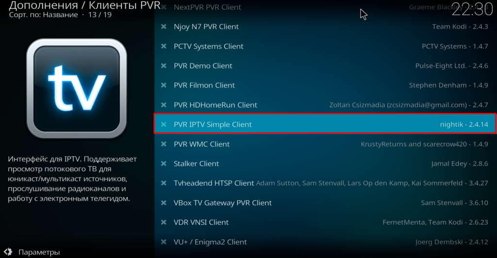 Найдите плагин, который называется PVR IPTV Simple Client, как показано на скриншоте.