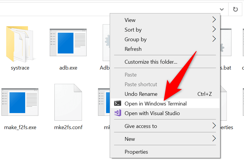 - Откройте папку ADB, щелкните правой кнопкой мыши в любом пустом месте и выберите «Открыть в терминале Windows».