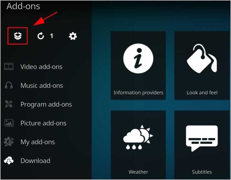 Как только эта предварительная настройка будет завершена, мы можем начать установку аддона, хранящегося в ZIP-файле. На главном начальном экране Kodi нажмите Add-ons в левом столбце.