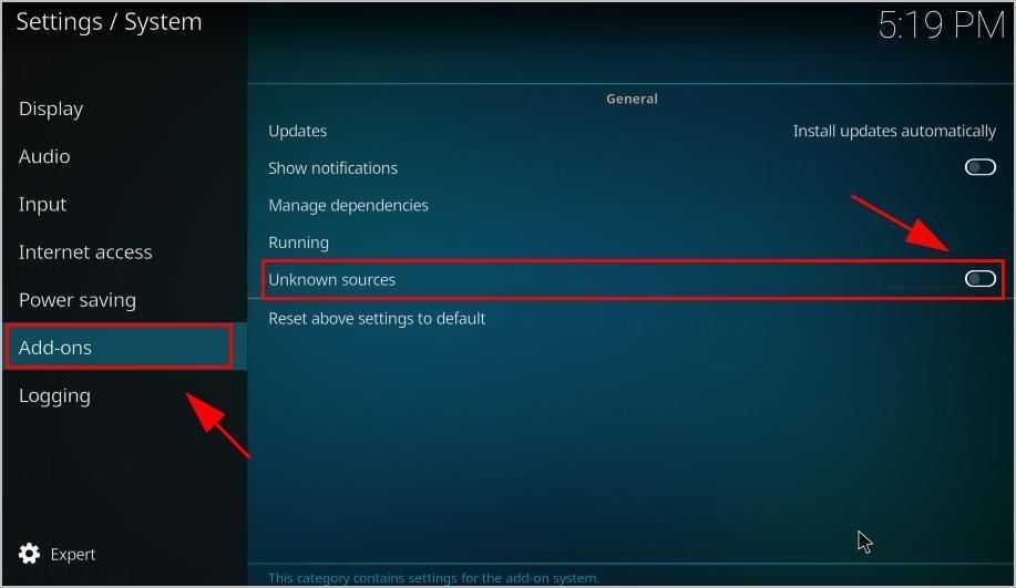 Иногда вам может потребоваться установить надстройки Kodi с неизвестных ресурсов, в то время как Kodi ограничивает загрузку надстроек и просмотр видео из неизвестных источников. Поэтому перед установкой надстроек Kodi вы должны настроить параметры Kodi на своем устройстве, чтобы разрешить использование неизвестных источников.