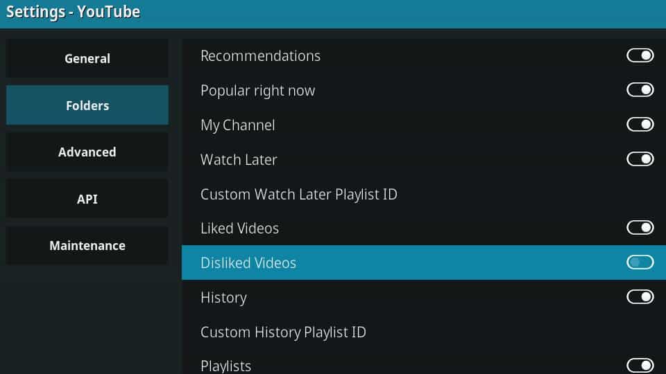 Next, click the Folders menu to the left, and take a look at what’s displayed by default. In my opinion, the list of displayed items is too long. At the very least, I like to disable showing Disliked videos because I probably clicked dislike for a reason.