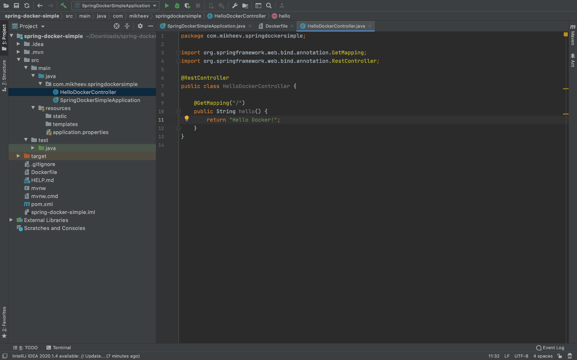 Класс помечен аннотацией @RestController, означающей, что он предназначен для обработки web-запросов. А метод помечен аннотацией @GetMapping c адресом «/» — перейдя по нему (выполнив get-запрос к http://localhost:8080/), мы получим сообщение «Hello Docker!»