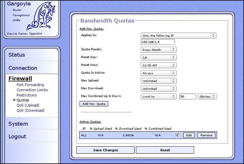Gargoyle — это бесплатное обновление прошивки для вашего беспроводного маршрутизатора, основанное на OpenWRT, но с улучшенным интерфейсом (не LUCI), ориентированным на простоту использования. Надежный, простой в использовании и настройке, и вы будете точно знать, где распределяется ваша пропускная способность, благодаря удобным графикам, доступным в интерфейсе администрирования.