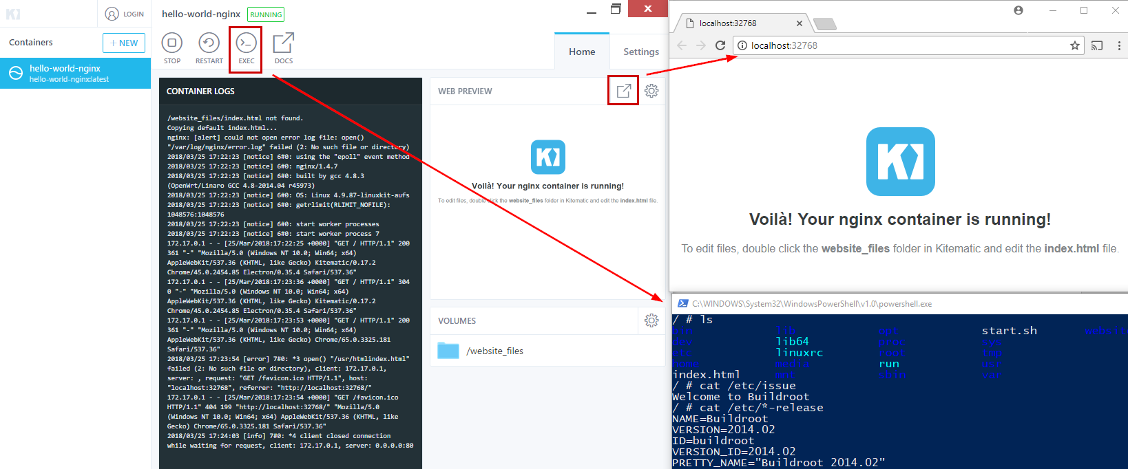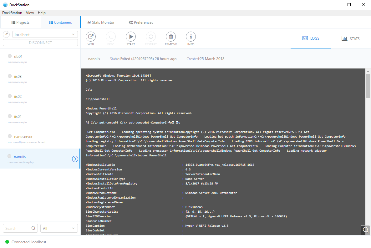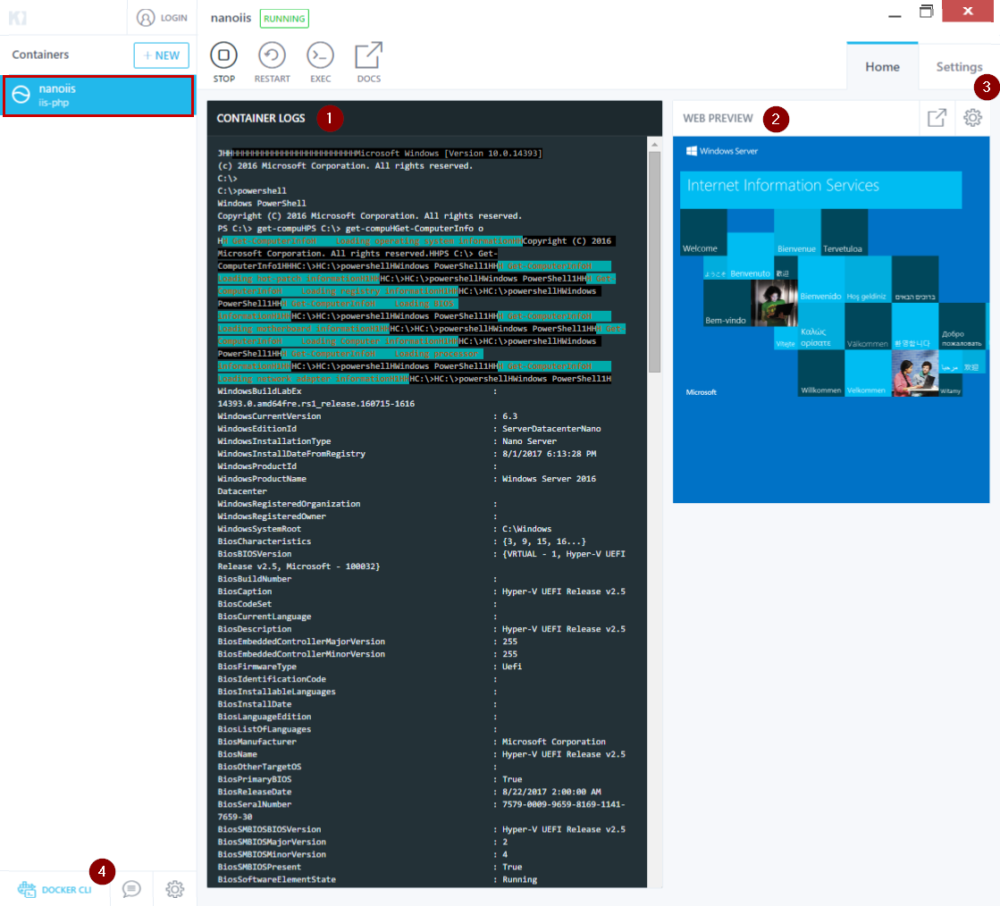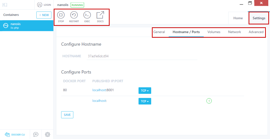 Here, I just want to manage my Docker Container, so I select ‘nanoiis’. With Kitematic, I will be able to: