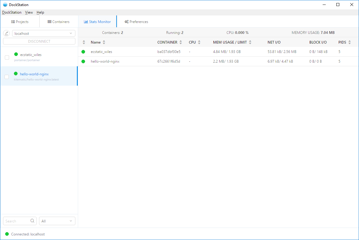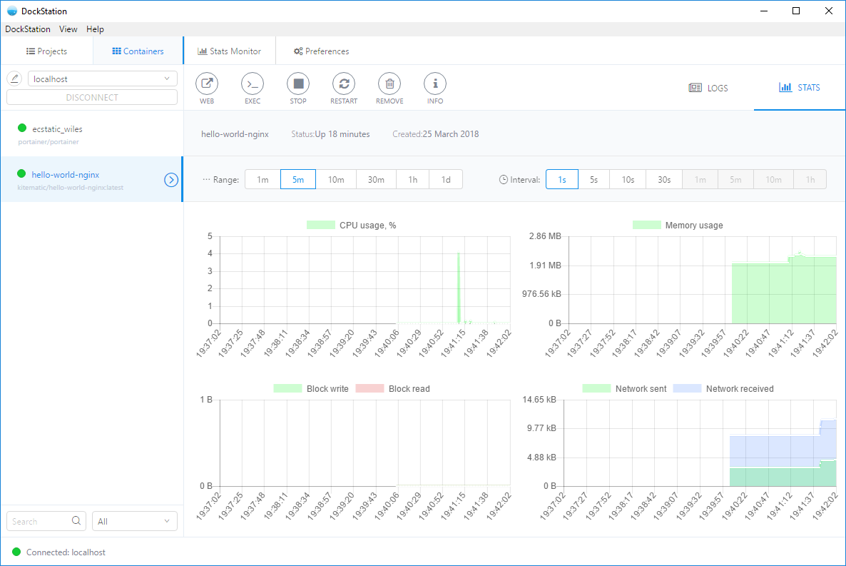 With DockStation, you can easily track CPU, Memory, Networks I/O, Blocks I/O usage and open ports. All work can be organized into projects, where you can check the status of each container, build a graphical scheme that visualizes each image in the project and relations between them. As an additional takeaway, DockStation works like charm with Docker Hub.