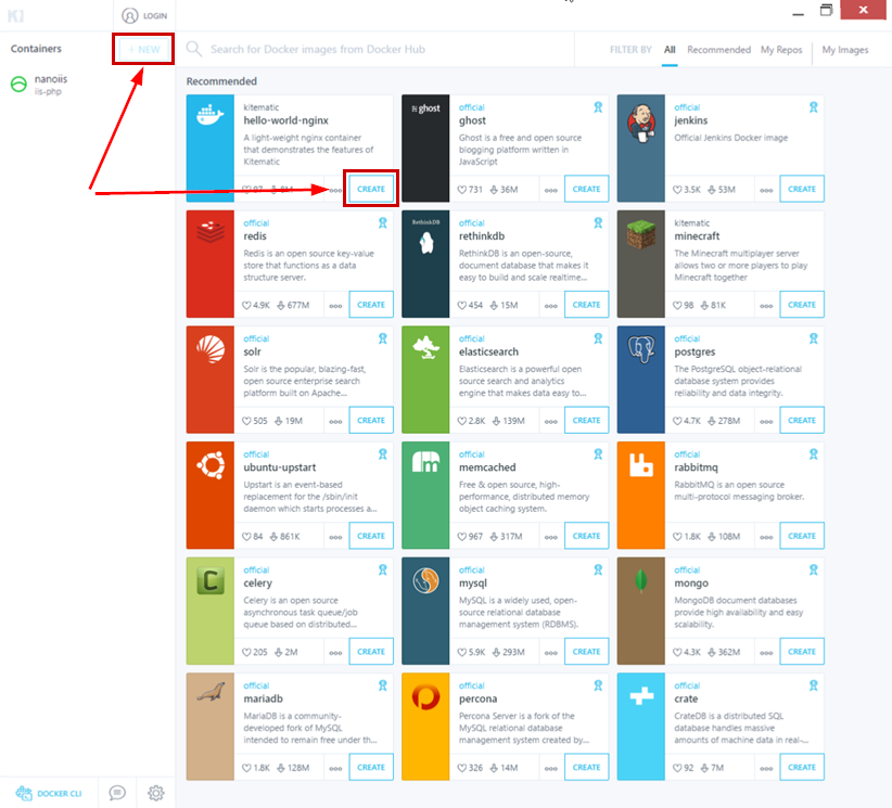 At the first screen, you will be able to connect to your Docker Hub account, but it is not mandatory. On the left side of Kitematic, you can interact with your Docker Containers that exist on your system. In my case, I can see my ‘nanoiis’ container which is running on my system. On the right side of Kitematic, I can create a new container by clicking ‘Create’: