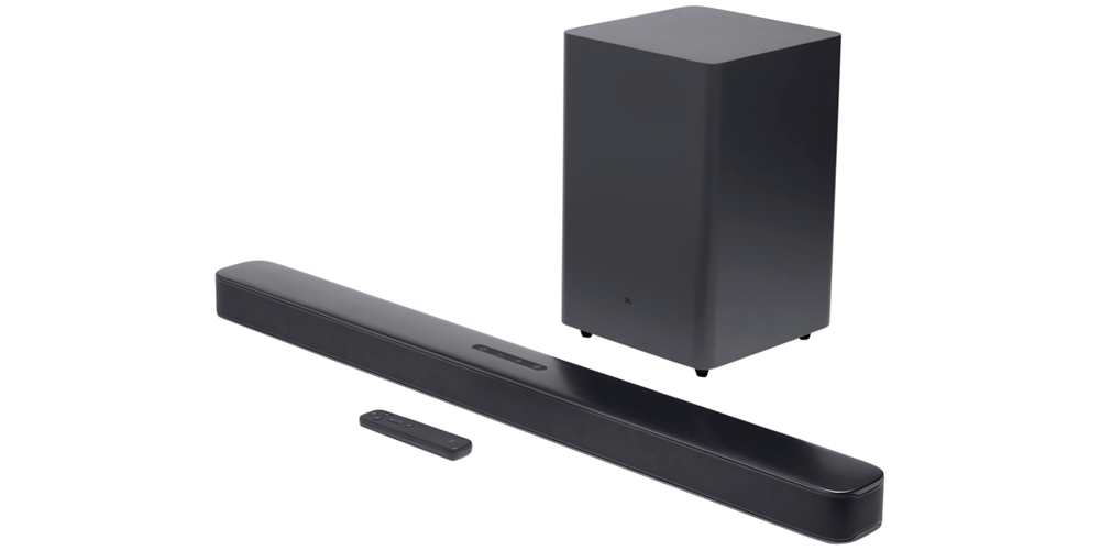 На втором месте расположился JBL Bar 2.1 Deep Bass. 300-ваттная акустическая система с преобладанием ВЧ и басов в звучании. Комплектный сабвуфер забирает на себя 2/3 части общей мощности (200 Вт). Ещё 100 приходится на две пары динамиков в основной панели. Коннект происходит по Bluetooth. Каждая составляющая имеет собственный усилитель и питается от сети. Управление — 4 кнопки на верхней грани и минималистичный пульт ДУ. Последним можно регулировать громкость, переключаться между источниками сигнала и регулировать басы. Иных настроек звука нет.
