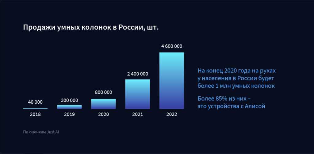 На конец 2020 года, по нашим данным, в России будет продано 800 тыс. умных колонок, таким образом, на руках у населения будет более 1 млн умных колонок. Более 85% от проданных устройств составляют колонки с ассистентом Алисой на борту.