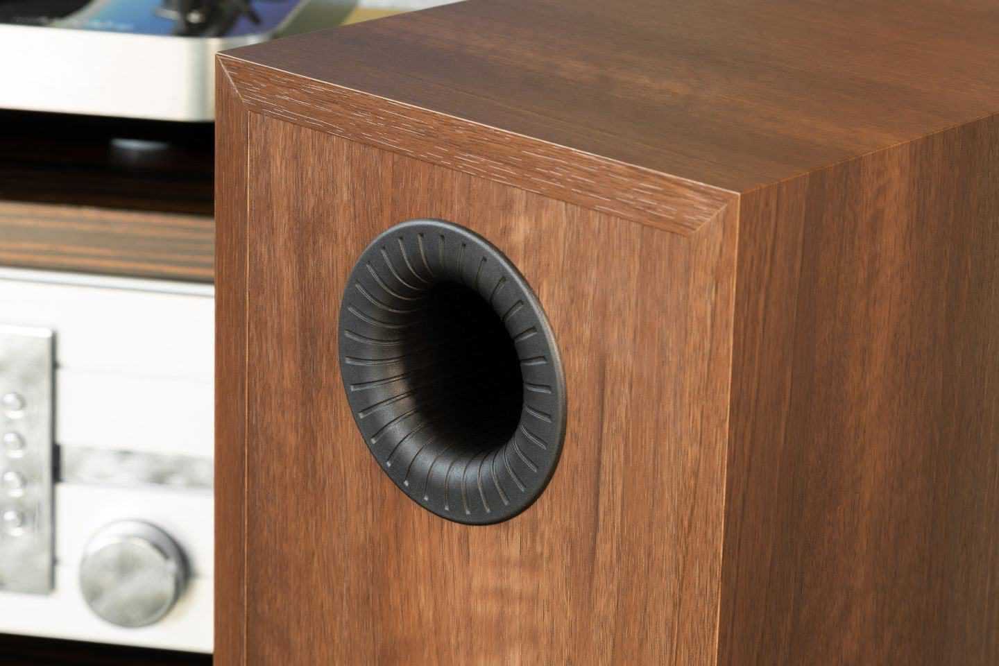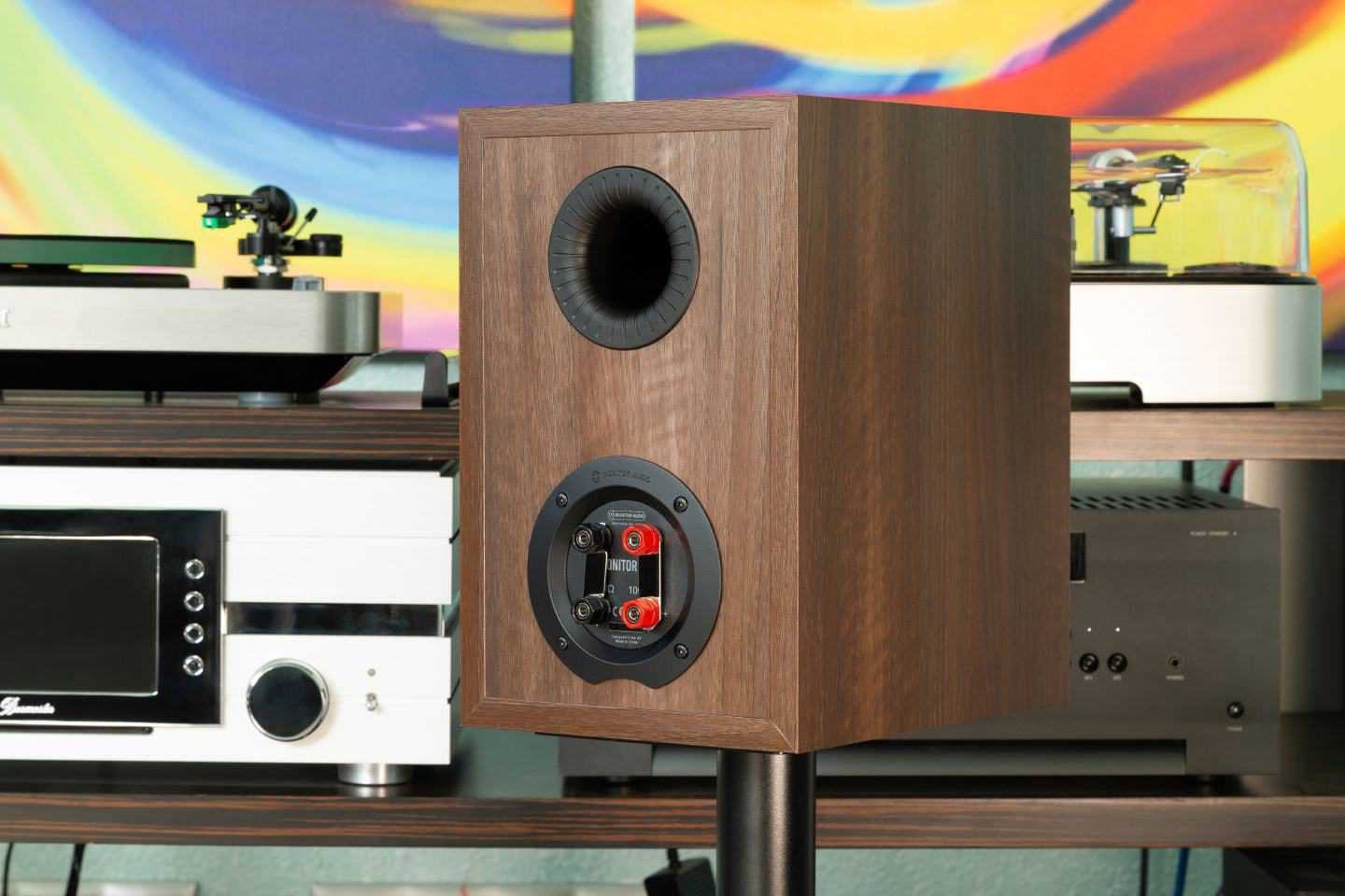 У модели Monitor 100 меня привлек еще один специфический акцент: гриль закрывает фасад не полностью, оставляя свободную полоску в нижней части. Это прямая отсылка к студийным полочным мониторам, появившимся в семидесятых годах, где часть фасада использовалась для установки ручек регулировки громкости СЧ- и ВЧ-динамиков. У Monitor 100 на этом месте расположены лишь логотипы, но выглядит отлично, особенно в отделке «орех». Орех на боковинах, естественно, не натуральный, но качество виниловой пленки высокое. На вид и на ощупь действительно напоминает полированное дерево.